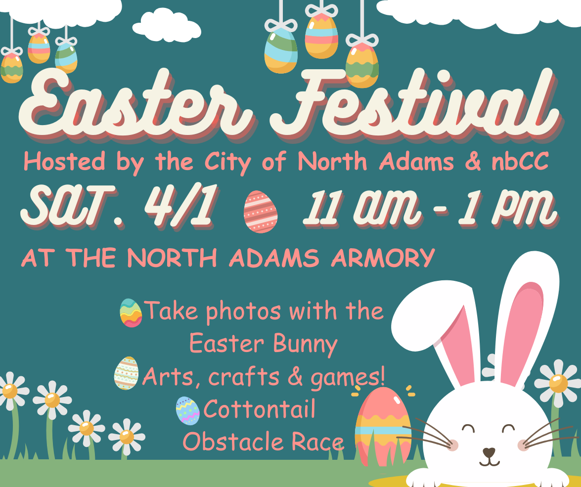 Join the City of North Adams, nbCC and the Easter Bunny for some FREE Easter FUN!Location: The Armory, 206 Ashland Street, North AdamsTime:11-1Schedule:11-1 PM: